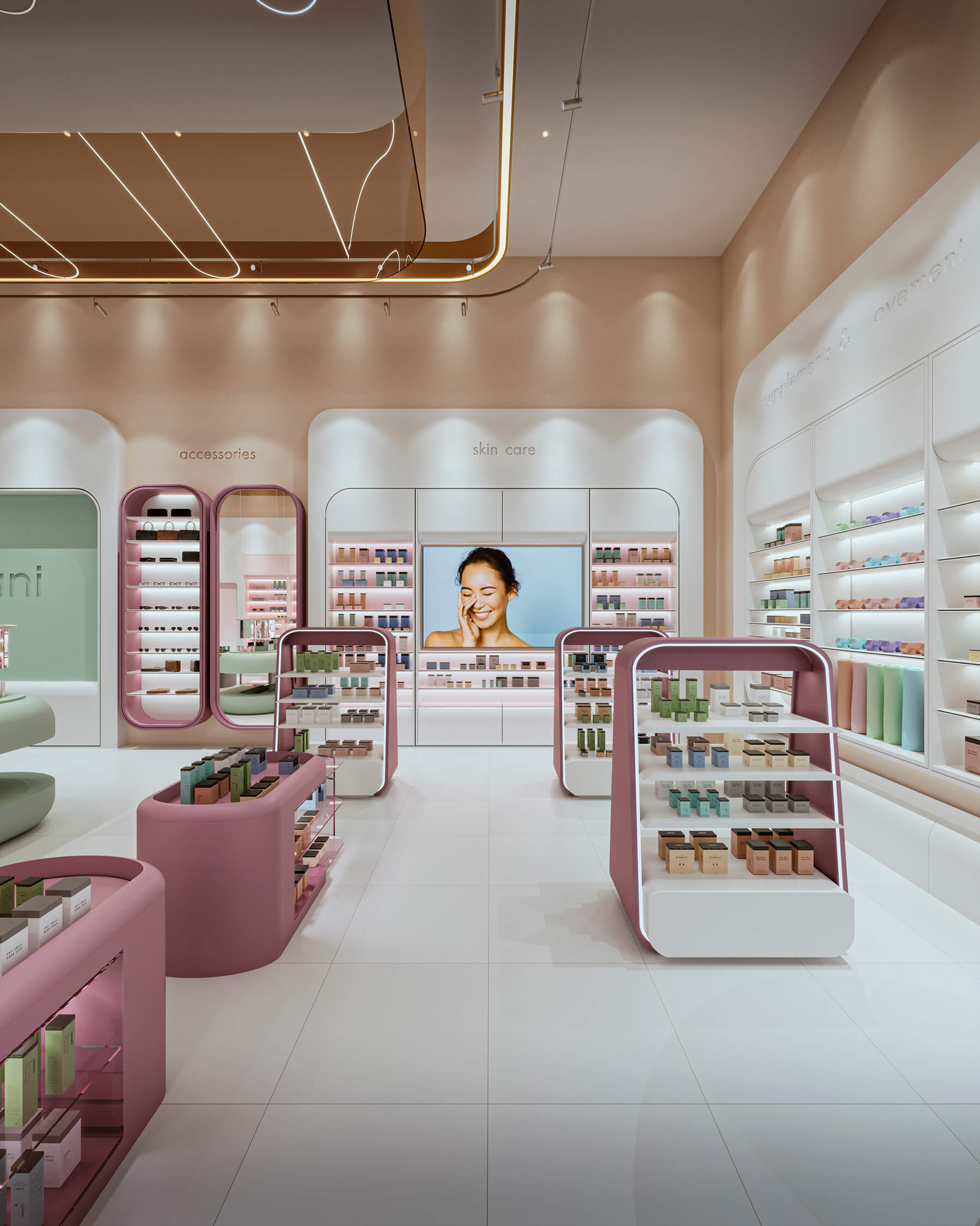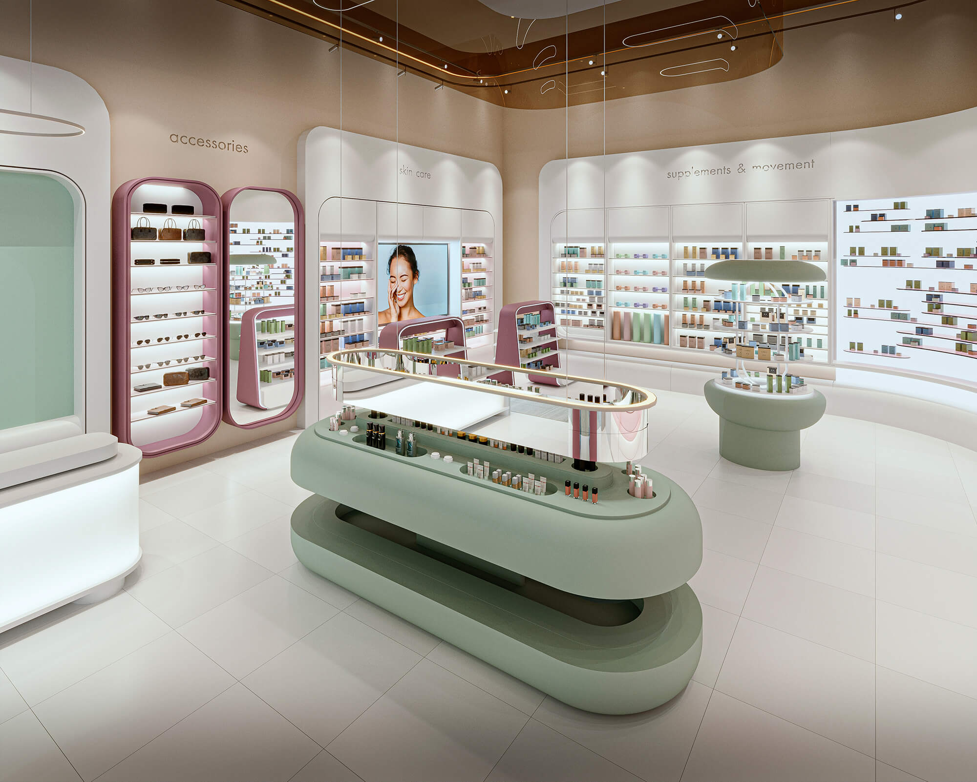 El mobiliario funciona como sistema organizador: las islas centrales promueven la interacción y el testeo, mientras que el perímetro agrupa y da claridad a cada categoría.